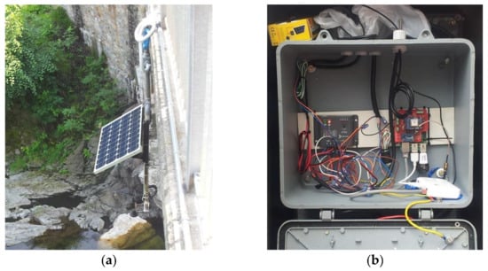 Hydrological station on River Cannobino: (a) hydrological sensor and solar panel; (b) detail of the contents of the shell: modem and various electronic elements.