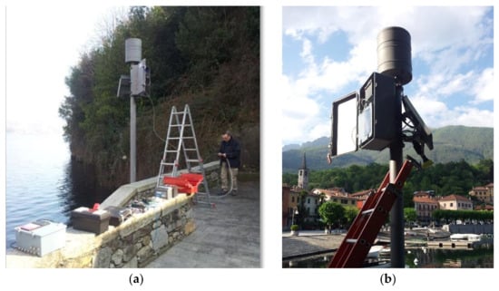 In Figure 3a,b is pictured the hydro-meteorological station placed on Lake Mergozzo that measures rainfall, air temperature, and lake level. The data collected with the new system allow the collection of hydro-meteorological information also useful for tourists.