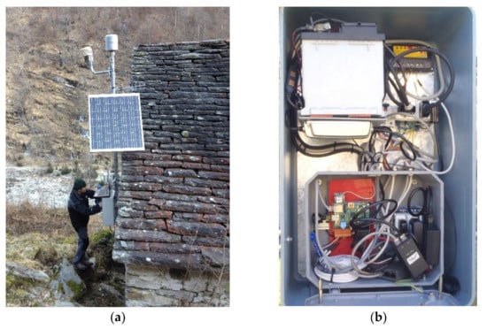 In Figure 4a,b, is pictured the meteorological station of Craveggia, which was placed in a location that is particularly difficult to reach, with little irradiation and very low temperatures in winter.