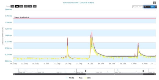 Between the end of 2020 and the beginning of 2021, a collaboration between our Institute and the Retemet Company (https://www.retemet.com/en/ (accessed on 6 December 2021) began, which led to the activation of meteo-hydrological stations in the Liguria Region, in order to test and refine our acquisition technologies and data transmissions in the meteorological-hydrological field and to obtain improvement feedback. From this collaboration a friendly output of the hydro-meteorological data was born, an example of which is shown in Figure 5 (https://www.navimeteoharbour.com/app/blowing/idrometro_core_history.html?id=sangiovanni (accessed on 6 December 2021).