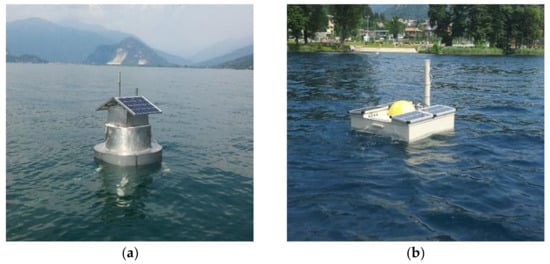 In particular, both fixed and mobile limnological buoys were built and deployed in the study lakes during the PITAGORA project (Figure 6) and after, with the SIMILE project (Integrated monitoring system for knowledge, protection and valorization of the subalpine lakes and their ecosystems), an Interreg Italian-Swiss project funded by the European Regional Development Fund (ID 523544). (https://www.progetti.interreg-italiasvizzera.eu/it/b/78/sistemainformativoperilmonitoraggiointegratodeilaghiinsubriciedeiloroe (accessed on 6 December 2021)).