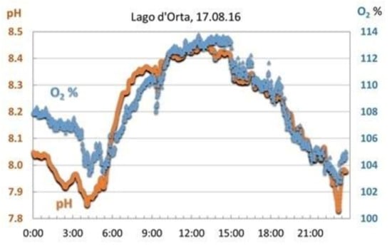 Example of how the high-frequency collection of limnological parameters can increase the degree of knowledge of the responses of a lake ecosystem. Graph shows hourly fluctuation of pH and oxygen.