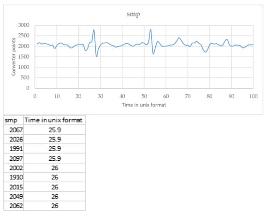 Example of graph and data outcome from geophones. The count starts at the Unix Epoch on 1 January 1970. Smp are the converter points, the number that the instrument gives, its analog signal.