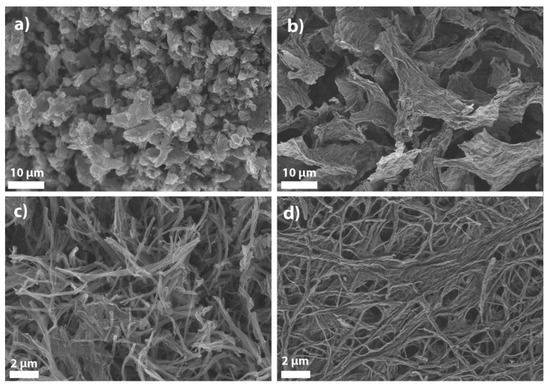 Graphene-based nanomaterials were synthesized according to a two-step top-down approach. Quasi-1D materials were synthesized by oxidative longitudinal unzipping of MWCNTs, while 2D materials were prepared by oxidative chemical exfoliation of graphite flakes. The formation of sheets (GO) and ribbons (GONR) after this synthesis step were confirmed morphologically using SEM imaging (see Figure S1). The second synthesis step was pyrolysis under reducing NH3 or inert N2 atmospheres. All pyrolyzed materials were also morphologically analyzed by SEM (Figure 1). The images clearly show exfoliated materials with relatively high specific surface area. htGO and N-doped htGO (Figure 1a,b) show crumpled flake-like materials, while htGONR and N-doped htGONR (Figure 1c,d) show quasi 1D ribbon-like materials. During the pyrolysis under N2 atmosphere, oxygen functional groups are reduced or decomposed, additional defects are introduced into the structure, and the material is furtherly exfoliated [32]. During the pyrolysis under NH3 atmosphere, N-functional groups are introduced into the structure in addition to the above-described processes. All processes significantly influence the properties of graphene-based nanomaterials. The detailed characterization of all the materials was published in our previous work [31] and is summarized below for the purpose of understanding the improved sensing properties.