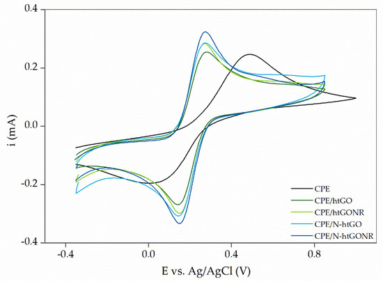 After drop casting and drying, the modified CPE were immersed in 0.1 M PB (pH 7.4), and their electrochemical properties were examined using CV and EIS. Both analyses were performed in the 0.1 M PB solution (pH 7.4) containing 5 mM [Fe(CN)6]3–/4–. First, it was determined which of the four tested graphene-based nanomaterials exhibited the optimal electrochemical properties in combination with other components of the electrode. Figure 2 shows cyclic voltammograms for bare CPE, CPE/htGO/MnO2/Nafion, CPE/N-htGO/MnO2/Nafion, CPE/htGONR/MnO2/Nafion, and CPE/N-htGONR/MnO2/Nafion. It is clearly seen that the combination of materials used for electrode modification, regardless of the choice of the graphene-based nanomaterial, improves the properties of the CPE. The redox peaks for bare CPE are significantly lower and wider than those of the modified electrodes. The peak-to-peak separation value (ΔEpp) is also an important parameter that provides information about the electron transfer rate at the electrode. The ideal ΔEpp value is 59.2 mV, as shown by the Nernst equation [42]. The ΔEpp values are 492, 128, 141, 125, and 116 mV for bare CPE, CPE/htGO/MnO2/Nafion, CPE/N-htGO/MnO2/Nafion, CPE/htGONR/MnO2/Nafion, and CPE/N-htGONR/MnO2/Nafion, respectively. These results indicate that the electron transfer rate is highest in the case of using N-htGONR, and therefore N-htGONR is the optimal material of choice. This hypothesis is supported by the peak heights in Figure 2 and is also consistent with the above discussed edge effects of the quasi-one-dimensional materials and the incorporated nitrogen functional groups.