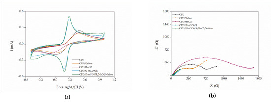 To furtherly confirm the choice of materials, a similar study was performed with the bare CPE, CPE/Nafion, CPE/MnO2, CPE/N-htGONR, and CPE/N-htGONR/MnO2/Nafion. The cyclic voltammograms in Figure 3a show significantly lower ΔEpp (about 100 mV compared to 320 mV for the bare CPE) and higher redox peaks whenever N-htGONR were used to modify the CPE, indicating that N-htGONR do in fact promote the charge transfer process. Slightly higher peaks were observed when N-htGONR and MnO2 were used, suggesting a synergistic effect of joint dispersion on the electrochemical properties. Wu et al. [28] described a similar phenomenon for a composite material of reduced graphene oxide nanoribbons and MnO2. The conductivity of the electrode surface is important for the analytical performance of the sensor, since it influences the sensitivity, as well as the reliability of the response. Therefore, Nyquist plots were recorded (Figure 3b) and charge transfer resistance (Rct) was determined. Obviously, the desired Rct value was as low as possible. The Rct values for CPE, CPE/Nafion, CPE/N-htGONR, CPE/MnO2, and CPE/N-htGONR/MnO2/Nafion were 725 Ω, 422 Ω, 1584 Ω, 19 Ω, and 6 Ω, respectively. As expected, the results were in agreement to those of CV measurements. The superior electrochemical properties of CPE/N-htGONR/MnO2/Nafion could be assigned to the high surface area and high conductivity provided by N-htGONR particles, as well as the above suggested synergistic effect between MnO2 and graphene nanomaterials.