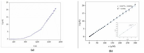 Figure 4. (a) Amperogram and (b) calibration curve obtained by adding five times 1 µM, five times 5 µM, seven times 10 µM and ten times 20 µM aliquots of H2O2 standard solution (in 0.1 M PB with pH 7.4). Operating potential was 0.65 V. The insert of Figure 4 (b) shows five additions of 1 µM aliquots, used to calculate LOD.