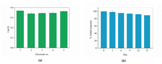 Figure 5. (a) Average current change for 5 µM H2O2 additions for each of the prepared electrodes in reproducibility study. (b) Percentage of the sensor’s retained initial response after 0–15 days in durability study.