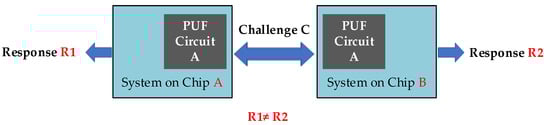 In recent years, the emerging Internet of Things (IoT) technology has simultaneously introduced challenges and opportunities for engineering-related fields. IoT devices include smartphones, smart cards, biomedical devices, radio frequency identification (RFID) tags, and many other cryptographic devices that require security characteristics, such as authenticity, integrity, and confidentiality in performing their tasks [1,2]. Security is one of the main current challenges for IoT [3,4,5,6] as it begins to materialize in our daily life and future industrial systems (Industry 4.0) [7]. IoT devices must face several tough challenges, such as low energy consumption, lack of computational resources [8,9], as well as the need to secure devices against cyber-attacks [10]. Authentication, authorization, and privacy are three sides of the security triangle in IoT. Authentication is the first barrier in front of cyber-attacks. Physical unclonable functions (PUFs) have been proposed as a lightweight, cost-efficient, and ubiquitous solution. Importantly for IoT developers, PUFs promise to achieve perfectly secure authentication without any cryptographic assets on the device, which makes them especially interesting for resource-scarce IoT devices [11,12]. The characteristics of a PUF include unpredictable response (R) as an output of the system owing to intrinsic variations, which are stimulated by the input challenge (C). The challenge–response system is modeled as a black box; hence, the PUF input–output relation is described as R = f(C), where f(.) is an unknown internal parameter influenced by the intrinsic variations of the device [13,14]. Practically, no two chips generate identical responses for a particular challenge, as depicted in Figure 1. The combination of a challenge and its corresponding response is called a challenge response pair (CRP).