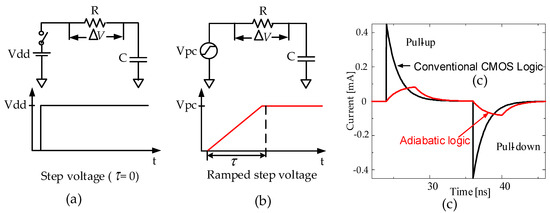 where R is the effective resistance in the driven device, C is the output node capacitance to be switched, τ is the time over which switching occurs, and Vdd is the voltage to be switched across. Ideally, the charging energy, EAdiabatic, tends to zero by increasing the length of τ. Conversely, the conventional CMOS logic operation is shown in Figure 2a, with the following equation: