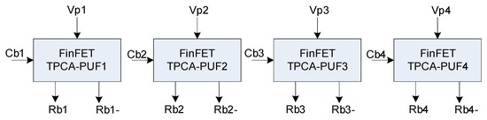 It has been revealed that the FinFET device has several advantages, such as higher on-state current, lower off-state current (lower leakage current), faster switching speed, and its double dual gates, enabling three possible connection modes (SG, IG, and LP) for low-power and high-speed applications. In this work, we have investigated the proposed TPCA-PUF cell using bulk FinFET with the 45 nm process for all SG, IG, and LP modes. As a result, we have found that SG mode is suitable for the proposed TPCA-PUF circuit topology. The gate connection type of LP and IG modes led to higher energy and produced the wrong response bits for a larger cascaded bit-length (4-bits in this work). Therefore, the whole work in this paper has utilized the SG mode connection type (refer to Figure 4).