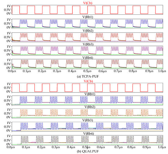 Monte-Carlo simulation result of the 4-bits TPCA-PUF and QUALPUF challenge–response signals are depicted in Figure 6. This result was obtained with a reference temperature of T = 27 °C and CL = 10 fF, fCb = 10 MHz, and fVpc = 100 MHz, with ±10% of Vth variation. The simulation results of response signals (Rb1–Rb4) with the given challenge bit (Rb) showed correct and stable operation for both PUF circuit topologies.