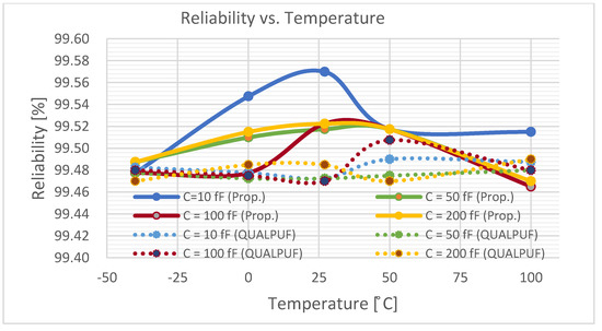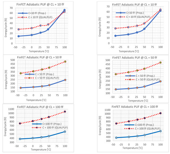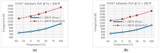 where T signals the period of the challenge bits (fCb = 10 MHz or inversely equal to 100 ns). Energy dissipation of 4-bits TCPA-PUF is depicted in Figure 7. Figure 7a,b depict an energy consumption comparison for ±10% tolerance variation of TOX and VTH, respectively, for a load capacitance that varies from 10 to 200 fF. The results show that the proposed FinFET-based TPCA-PUF consumes lower energy compared to the QUALPUF topology [35].