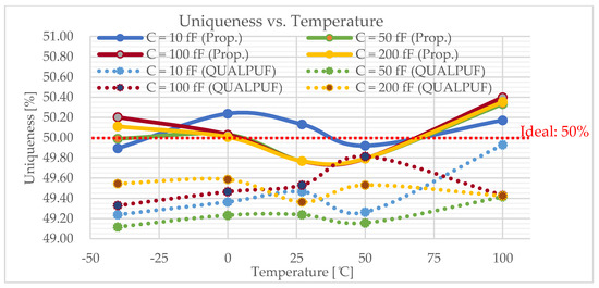 To enable the calculation of uniqueness, reliability, and the BER (Equations (2)–(4)), we conducted Monte-Carlo simulations with bit size of n = 4, and the chip number of k = 100. The calculation result of the uniqueness is graphically depicted in Figure 8, and the results of the reliability and the BER are shown in Figure 9 and Figure 10, respectively, all under the condition of ±10% VTH variations. Output nodes’ capacitors also vary from 10 to 200 fF to emulate the practical chip connection. In Figure 8, Figure 9 and Figure 10, the solid lines depict the proposed FinFET-based TPCA-PUF and the dotted lines show the FinFET-based QUALPUF.