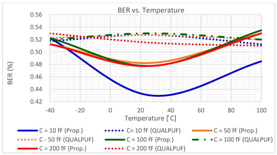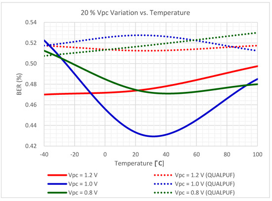 Unexpected supply voltage fluctuation may also affect the reliability of any PUF performance. Hence, we have also further evaluated the reliability of the proposed adiabatic PUF against supply voltage variations. The 100 PUF instances were simulated under different supply voltages from 0.8, 1.0, and 1.2 V, for 45 nm bulked FinFET technology, and at three different temperatures of −40, 27, and 100 °C. The responses were read with 1.0 V as a reference, and then BER was calculated, as depicted in Figure 11. This figure indicates that the proposed TPCA-PUF cells are more resilient and stable under supply voltage variation at around normal temperatures.