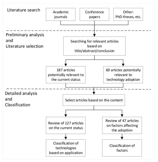 The method used for the literature review took place in seven sequential steps. These steps are “scope definition and clarification”, “a literature search” to find potential relevant resources, “a preliminary literature analysis” and “relevant literature selection” to identify and shortlist relevant literature, “detailed literature analysis” to extract related materials, “classification of the findings” for the sake of easy reporting, and finally, “reporting the results”. The process followed for the literature review in this chapter is presented in Figure 1, which also specifies the number of articles identified and shortlisted for both the current status of sensing technologies in construction and the factors affecting their adoption. Of 187 potential articles on types of sensing technologies and their applications in construction, 127 were selected to classify technologies based on their applications. Of 69 articles relevant to the adoption of technology, 47 were subsequently analyzed to identify factors affecting the adoption of sensing technologies in construction.