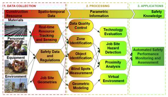 Location-based sensing technologies, also known as Real-Time Locating Systems (RTLS), are based on wireless technologies including Wi-Fi, Bluetooth, Global Positioning System (GPS), Radio Frequency Identification (RFID), and ultra-wideband (UWB) technology. RTLS are effective in construction management on the process, safety, and on-site resource through locating and tracking construction materials [,]. These systems are also effective in situational awareness enhancement [,], quantitative hazard exposure analysis [,], and behavior-based safety monitoring []. The data collection, information processing, and application framework of RTLS are presented in Figure 2. However, they still have shortcomings such as weak signal, high cost, and low accuracy []. The applications and limitations of the most common technologies are investigated as follows.