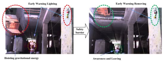 RFID technology identifies objects through radio waves, reading digital data encoded in RFID tags without direct contact or line-of-sight. The advanced technology is more efficient in tracking materials and equipment compared to traditional barcode systems []. An RFID system usually consists of a reader transmitting radio waves, radio frequency tags attached to items, and a software system managing collected information []. Furthermore, the RFID system obtains versatile tag categories to satisfy construction demands. An active tag equips a built-in power source enabling the tag to transmit data on its own. Passive tags are more popular than active tags as they are smaller and cheaper. RFID technology presents great performance on both outdoor and indoor construction projects, where satellite position information is unavailable [,]. For instance, RFID technology can secure construction safety when the gate crane driver cannot observe the workers at the bottom of the tunnel shaft []. The RFID tags on helmets and RFID readers around this area will generate safety warnings for the potential hazard during vertical transportation (Figure 3). Then, the nearby workers would be informed to leave this hoisting area. Other utilities of RFID technology in reducing safety risks are summarized in Table 2. The RFID system has been identified as the most popular sensing technology among all RTLS, although its adoption is still slow []. Some limitations restrict the RFID technology application including simultaneous identification of multiple tags and range issues due to metal obstacles.