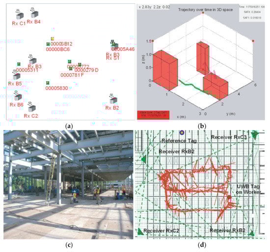 Experiments for obstacle avoidance and field personnel tracking: (a) receiver (Rx…) and tag (00…) layout during field trial; (b) predefined hazardous areas, UWB path, and alarm box; (c) steel structure in field trial; and (d) unfiltered UWB data on the trajectory of a worker [].