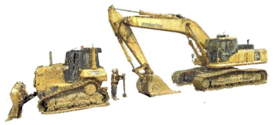 Vision-based sensing technologies range from well-established technology photographs and video recordings to contemporary technology laser scanning, benefit safety management. Photographs and video recordings technology promotes decision making of operations, blind lifts of tower cranes, and communication between project network and work-front operations [,,]. Laser scanners capture detailed geometries and environmental conditions through laser signals emitted from a rotating laser photon source []. The scanners are used in intensifying situational awareness of crane operators [], simulating construction sites [], and monitoring the construction activities [,,]. The hazardous situation of workers and equipment measured using a 3D laser scanner is demonstrated in Figure 5. However, laser scanning technology is not suitable for moving objects or providing information about colors, textures, and materials. Other factors also restrict the implementation, including a clear line-of-sight requirement, long data processing time, and high data storage capacity.