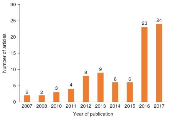 OHS is a major division of construction safety management in which sensing technologies contribute to remarkable improvements. Articles on sensing and warning technologies have increased exponentially since 2016, indicating that sensing technologies are effective in OHS (Figure 6). OHS is strengthened by vision-based sensing technologies comprising Closed-Circuit Television (CCTV), video cameras, range cameras, and built-in sensors of smartphones [,]. Methods of the above technologies to assess the effects of wearing hard hats are demonstrated in Table 4. Additionally, RFID technology secures OHS by checking the presence and compliance of personal protective equipment. Moreover, wearable sensors and environmental sensors have been a focus of research in securing OHS []. Wearable devices could simply be available devices such as smartwatches and wristbands which integrate various sensors for monitoring of workers’ health [,]. Specific devices such as a chest sensor recording heart rate and heart rate variability are also included in wearable sensing technologies. The effects of wearable sensing technologies in promoting OHS are demonstrated as follows.