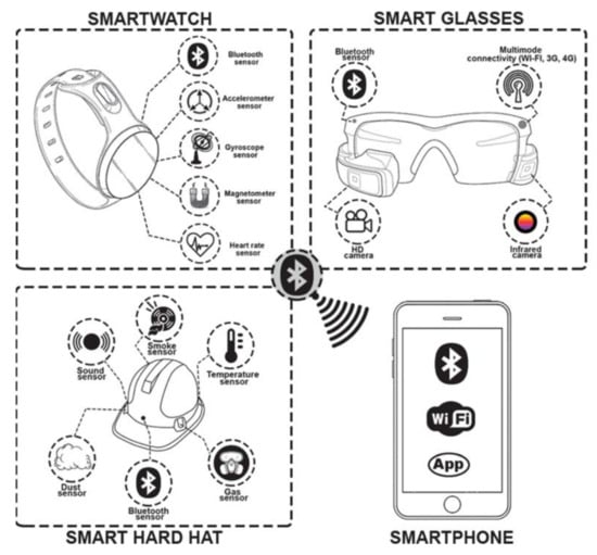 Wearable sensing technologies attached to PPE realize safety risk detection and health monitoring. To begin with, Inertial Measurement Units (IMUs) are the most common motion sensors in PPE to detect awkward postures [], gait abnormalities [], and fall-risk assessments []. IMU-based wearable motion capture system (Perception Neuron) used in acquiring experiment data is exhibited in Figure 7. Furthermore, pressure sensors and three-axis accelerometers are valid in assessing the PPE wearing effect [,]. Moreover, dust sensors can monitor fine particle concentration and protect workers against excessive respirable dust [,]. Lastly, Adjiski et al. [] proposed a prototype system, which was an outstanding example of different sensors integrated into a system and attached to PPE. In the system, helmets and safety glasses were equipped with sensors connected with smartphones and smartwatches (Figure 8). Sensors used in the system included gas sensors, dust sensors, sound sensors, smoke sensors, temperature sensors, accelerometers, gyroscopes, magnetometers, heart rate sensor measures, and cameras. The prototype system designed to secure OHS during mining operations also meets requirements on other underground construction operations.