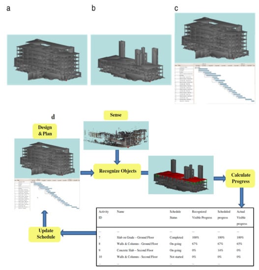 (a) 3D model, (b) time-stamped 3D model, (c) 4D model, and (d) procedure for automated progress calculation and schedule update [].