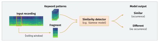 Due to the aforementioned problems with data availability, we have opted for the second option, i.e., developing a keyword detection system based on the perceptual similarity of acoustic fragments. Figure 1 presents a schematic depiction of this approach. The main principle of such a system lies in sequentially processing small fragments of an input recording. Each extracted fragment is then compared to a set of predefined exemplary patterns representing specific keywords. If a significant similarity is found, the system reports detection of a given keyword at a particular point in time.
