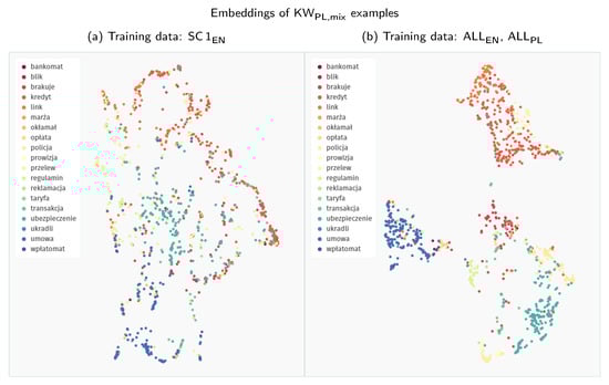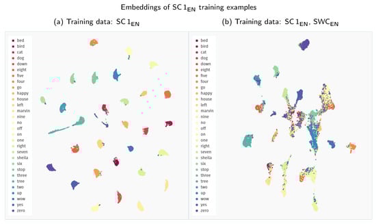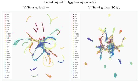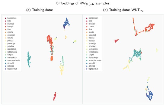 Comparison of the UMAP visualisations of Polish keywords processed through the Google speech embedder: (a) embeddings generated with a pre-trained model without fine-tuning; (b) embeddings generated with a pre-trained model fine-tuned on WUTPL training examples.