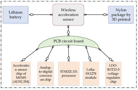 The overall structure of the wireless acceleration sensor is composed of a PCB circuit board, lithium battery, and 3D-printed nylon package, as shown in Figure 1. The PCB board is mainly composed of circuits modules, resistors, and capacitors to ensure mutual communication between the modules. The modules are an MEMS acceleration sensor chip ADXL354, AD7689 analog-to-digital conversion chip, STML32L151C8x6 processor, LoRa-SX1278 wireless communication module and LDO-SOT23-5 voltage regulator. The data collected by the acceleration chip are converted into a digital signal by the AD7689 chip, and then processed by the STML32L151C8X6 processor. Finally, the data are wirelessly transmitted to the gateway through the LoRa-SX1278 module [19,20] and can also be transmitted to the computer through the serial port.