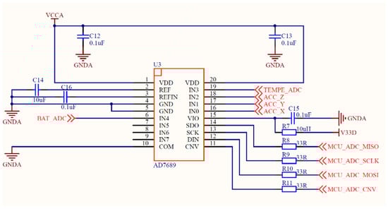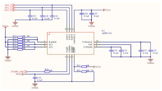 The circuit diagram of ADXL354 is shown in Figure 2. It uses multiple 0.1 μF ceramic capacitors to fully decouple the accelerometer to eliminate power noise. There are high-frequency noises generated by vehicles, instruments, collisions, etc., when the sensor collects data on the bridge; therefore, the output terminals of the X, Y, and Z axes are connected with a 0.1 μF filter capacitor respectively to filter out the high signal generated by noise [21], so as to collect the raw data of bridge vibration.