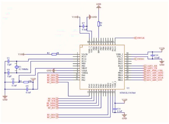 STM32L151 is an ARM-based 32-bit microcontroller, as shown in Figure 4, which is an ultra-low power chip with 0.3 μA standby mode (three wake-up pins), and its core is ARM Codex-M3 CPU. The supply voltage is 2.0 V to 3.6 V. STM32L151 embeds a built-in boost converter. VDD is an external power supply for I/O and internal regulators. The minimum voltage applied to VDDA is 1.8 V when the ADC module is used. At this time, VDDA and VSSA must be connected to VDD and VSS, respectively [22].