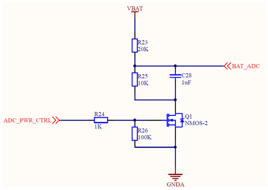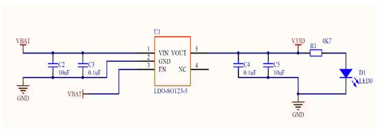 LDO-SOT23-5 is a voltage regulator chip which reduces the battery voltage output to 3.3 V through the acquisition circuit and continuously supplies power to the CPU. The resistor R1 (4.7 kΩ) can play the role of current limiting to protect the circuit, as shown in Figure 5.