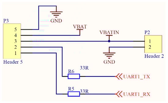 A battery voltage acquisition circuit is shown in Figure 6. The sensor collects the voltage of the lithium battery through this circuit, and then reduces the battery voltage to 3.3 V through the LDO-SOT23-5 circuit to supply power to the CPU. The circuit diagram of a serial port and power interface is shown in Figure 7. The serial port can output collected data to the computer or supply power to the lithium battery by connecting an external power.
