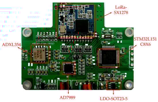 The red boxes in Figure 8 are an ADXL354 accelerometer chip, STM32L151C8X6 processing, AD7989 analog-to-digital conversion module, LDO voltage regulator chip, and LoRa wireless communication module. These components enable bridge vibration data to be collected in real time and transmitted wirelessly. The holes in the four corners under the circuit board are screw holes, whose purpose is to fix the circuit board to the package box and prevent the circuit board from effecting the data collection due to unstable movement.