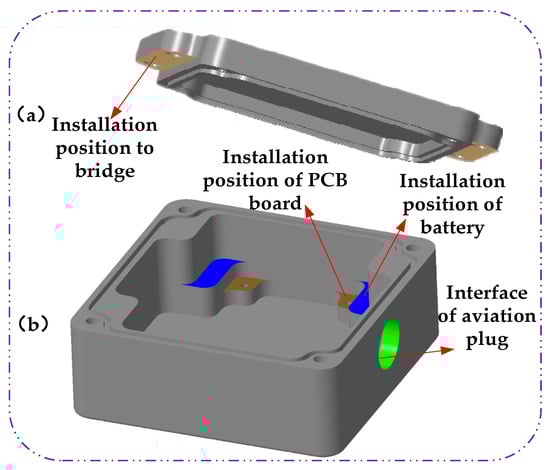 The package box of the wireless acceleration sensor in this paper is shown in Figure 9; (a) is the top cover of the package box. There are two outrigging ears on both sides of the top cover, whose purpose is to facilitate the installation of the sensor on the bridge. (b) is the base of the package box, the brown color in Figure 9 is the installation position of the sensor PCB board which is fixed by screws, and the blue part is the installation position of the lithium battery. The green round hole is the aviation socket. The internal lithium battery can be charged through the aviation socket, so that the sensor can be used continuously. The sensor can also be connected to the serial port USB to transmit data to the computer through the aviation socket.