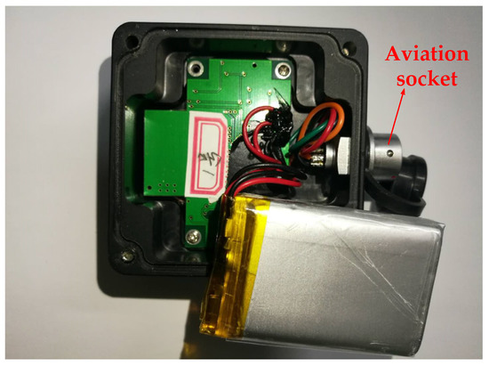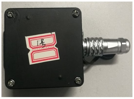 The package box by 3D printing was accomplished to facilitate installation of the cantilever sensor, and the material of box is nylon. The circuit board and battery were installed into the package box, as shown in Figure 10. The red arrow shows the aviation socket, which has three main functions: (1) it can be connected to the power supply to supply power for the sensor; (2) the sensor circuit board will power on and start working after being inserted into the aviation plug; (3) the data can be transmitted to the computer through the serial port.