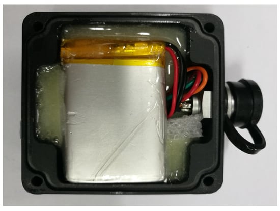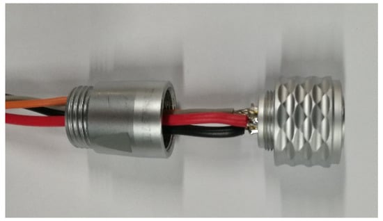 Figure 11 shows the internal diagram of the acceleration sensor after glue filling. The circuit board and the lithium battery were fixed inside the nylon box to prevent the damage of the circuit board due to the vibration of the lithium battery. The aviation sockets of the wireless acceleration sensor developed in this paper has four pins, which are the GND ground pin, the serial output pin, the power pin and the switch pin. The aviation socket was equipped with an aviation plug which has four identical pins. The power pin and switch pin of the aviation plug were welded in this paper, and the aviation plug was filled with glue, as shown in Figure 12 and Figure 13. The wireless acceleration sensor can be connected to the power supply to collect data by inserting the aviation plug into the aviation socket, and the aviation plug after filling can also play a role in waterproofing. The finished product of the wireless acceleration sensor is shown in Figure 14.