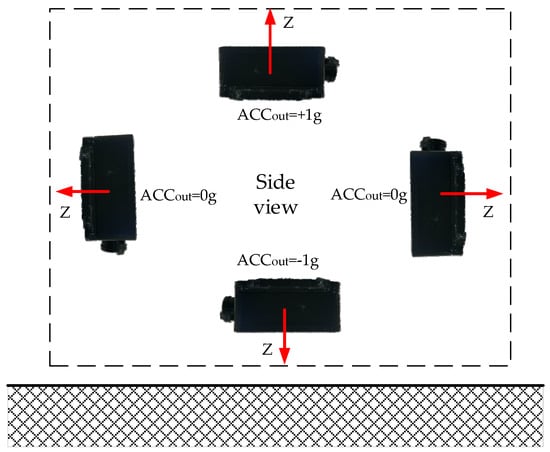 Four wireless acceleration sensors have been produced in this paper which should be calibrated first. Set the three directions of the acceleration sensor as X, Y, and Z, respectively. Place the developed sensor No. 1 horizontally, with the Z direction facing upward. Its value was 34,325, and at this time, its gravity acceleration was 1 g. Place the sensor vertically, with Z direction facing horizontally. Its value was 23,898 with under 0 g of gravitational acceleration. Place the sensor horizontally in the opposite direction, with the Z direction facing downwards. Its value was 13,610. The schematic diagram is shown in Figure 15.