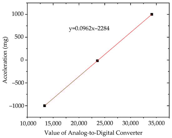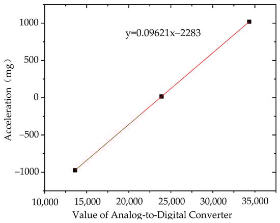 Fitting the analog value to its corresponding acceleration value, the results of sensor No. 1 and No. 2 are shown in Figure 16 and Figure 17.