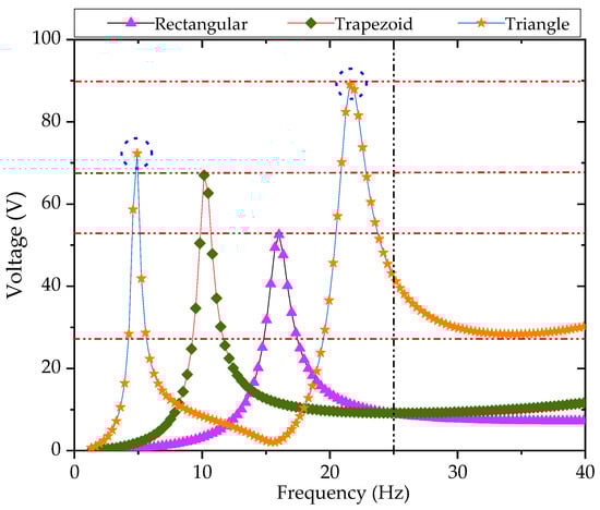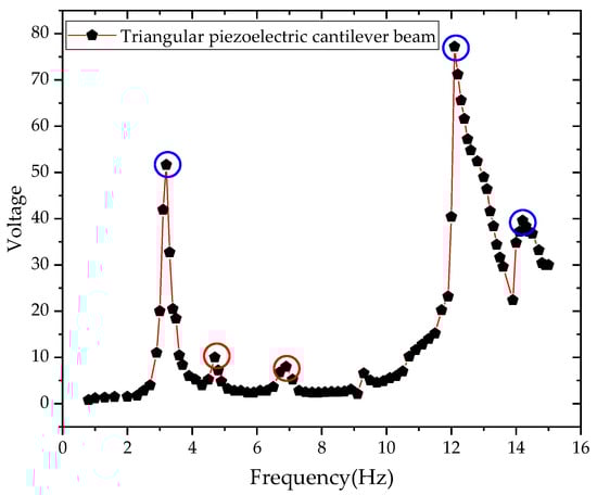 It can be seen from Figure 22 that the output voltage of the triangular cantilever beam was higher than the rectangular cantilever beam; the resonance frequency is lower, and there are more resonance points in the low-frequency range than the rectangular cantilever beam. Therefore, triangular PCBs are more practical than rectangular in terms of energy collection.