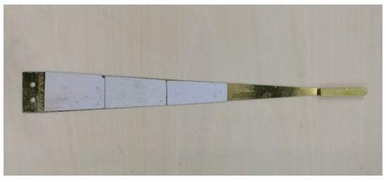 The sample of the triangular PCB was made according to the size parameters [24]: the length of the substrate is 320 mm, the width is 40 mm, and the thickness is 0.35 mm. The thickness of the piezoelectric plate is 0.25 mm and the weight of the mass block is 12 g. The sample is shown in Figure 19.