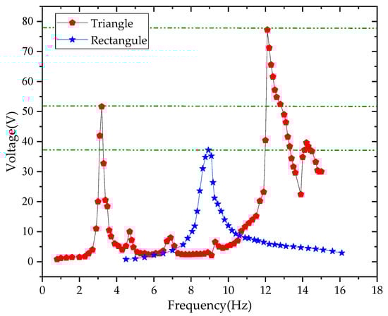 It can be seen from Figure 21 that the first- and second-order vibration frequencies of the triangular PCB were within the low frequency range (0–15 Hz). The sample reaches the first-order resonance at 3.2 Hz and a voltage value of 51.6 V. The sample reaches the second-order resonance at 12.1 Hz and a voltage value of 77.2 V. This paper has compared the physical test results of triangular and rectangular PCBs, as shown in Figure 22.