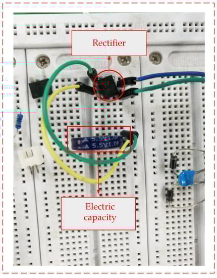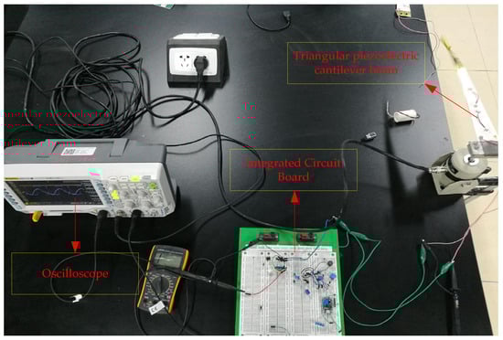 The power generation capacity of triangular PCB was carried out in this paper. A power amplifier, hev-20 high energy exciter, dpo-2024 oscilloscope, breadboard and rectifying device were used to test the triangular PCB. Rectify the output voltage of the PCB on the breadboard, and then connect the capacitor for charging, as shown in Figure 23. We adjust the high energy exciter so that the excitation frequency of the cantilever beam was 12 Hz, and then connect the cantilever beam output end to the input end of the breadboard and connect the output end of the breadboard to the oscilloscope, as shown in Figure 24. The capacitor voltage value and the corresponding times tested by the oscilloscope were recorded and the relationship curve between voltage and times was plotted, as shown in Figure 25.