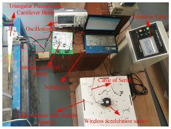 If the PCB is placed on the bridge, then it can absorb the vibration energy of the bridge and convert it into electrical energy to supply power to the sensor or indicator light [16]. However, the bridge vibration frequency is low, and the piezoelectric cantilever beam used for bridge vibration energy collection must have a very low resonance frequency and high performance output. This paper has studied the principle of wireless sensors, and a wireless acceleration sensor was developed based on the needs of bridge health monitoring, which can be conveniently placed anywhere on the bridge. Then, the structure of the PCB is studied and optimized to improve the piezoelectric output performance according to the characteristics of the bridge vibration. Finally, a piezoelectric transducer device suitable for bridge vibration energy collection and wireless sensor power supply is developed, which realizes the self-powered performance of bridge sensor nodes. The voltage of the triangular PCB developed in this paper reaches the first peak value of 51.6 V at 3.2 Hz, and the voltage reaches the second peak value of 77.2 V at 12.1 Hz; its resonance frequency is lower than that of the cantilever beam developed by previous scholars, and the output performance is higher, which is more suitable for application in the bridge’s low frequency vibration environment.