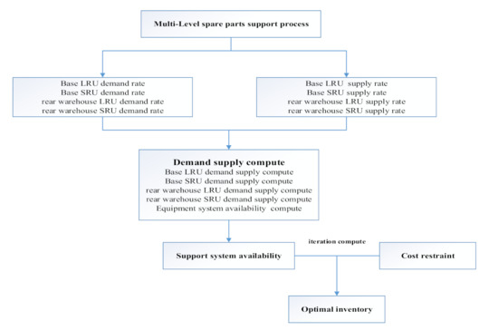 The demand–supply steady-state process-based multi-level spare parts optimization process is an analytical calculation process, which is shown in Figure 2. Firstly, according to the multi-level spare parts support process, each level spare parts demand rate of each support echelon is derived. The order of derivation is the first level spare parts demand rate of the base, the second level spare parts demand rate of the base, the first level spare parts demand rate of the rear warehouse and the second level spare parts demand rate of a rear warehouse. Then, according to the support process and the demand rate of specific support echelon spare parts, the spare parts’ supply rate of each support spare part is derived. The order of derivation is the second level spare parts’ supply rate of the rear warehouse, the first level spare parts supply rate of the rear warehouse, the second level spare parts supply rate of the base and the first level spare parts supply rate of the base. Next, five sub calculation processes of demand–supply are constructed, which are respectively the calculation of spare parts availability and support delay time at the second level of the rear warehouse, the calculation of spare parts availability and support delay time at the first level of the rear warehouse, the calculation of spare parts availability and support delay time at the second level of the base, the calculation of spare parts availability and support delay time at the second level of the base, the first level of base spare parts availability and support delay time calculation and base equipment availability calculation. Then, the availability of the whole equipment support system is calculated according to the five sub calculation processes. Finally, according to the objective function, the maximum availability and the cost limit constraint condition, combined with the marginal analysis method, the spare parts’ optimal inventory at all levels is derived.