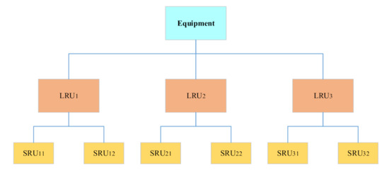 The multi-indenture structure describes how the whole equipment system is composed and how the spare parts are assembled, as shown in Figure 4. LRU is the first level of spare parts. When the first level spare parts are disassembled at the maintenance point, it is found that the fault of the LRU is caused by the sub-component of the LRU, which is replaced. Here, the sub-component is called the shop replacement unit (SRU) [16], also known as the second-level spare parts. All components that can be directly removed from LRU are called SRU. Similarly, when the SRU continues to be repaired in the workshop, the SRU is disassembled. It is found that the failure is caused by the sub-components of the SRU, which can be called sub shop replacement unit (SSRU), also known as the third level spare parts. By analogy, all levels of spare parts have their level of spare parts name.