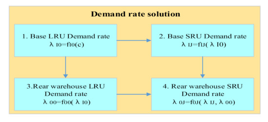 The specific solving order of each demand rate and the relationship between them are shown in Figure 6. We take the data given by the equipment system in advance as constant c. First, we calculate the LRU demand rate of the base according to the known information, which is not associated with other demand rates. Second, according to Formulas (2) and (4), the SRU demand rate in the base and LRU in the rear warehouse are functions of the spare parts demand rate. So, the SRU in the base and LRU in the rear warehouse demand rate can be calculated at the same time. In the third step, according to Formula (5), the SRU demand rate of the rear warehouse is a common function of the SRU demand rate in the base and the LRU in the rear warehouse. So, the SRU demand rate of the rear warehouse can be solved by combining the two demand rates.