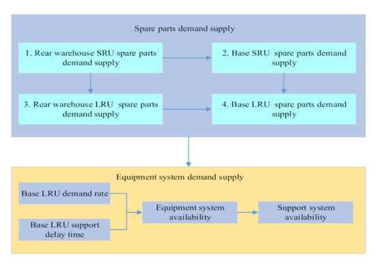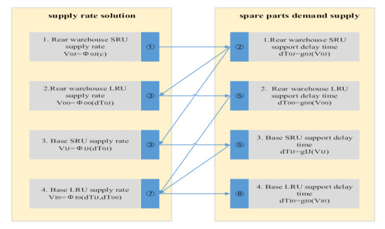 According to the demand–supply model, we only need to know the spare parts’ initial number and the maximum shortage number in the system state, the demand rate and supply rate between each state transition. We can get the expected shortage number and the availability of spare parts. If the research spare parts’ failure-free working time obeys the exponential distribution, then we can get the expected spare parts to support the delay time. The failure-free working time of the first level spare parts LRU and the second level spare parts’ SRU obeys exponential distribution, then the above three kinds of data can be obtained by establishing spare parts, demand–supply model. The correlation and solution sequence of supply rate and support delay time are shown in Figure 9.