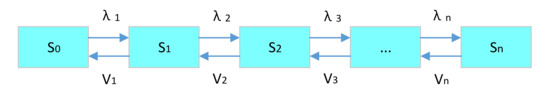 The three decisive variables of the multi-level spare parts demand–supply model are system state variables, demand quantity and supply rate. The system status variable represents the current inventory of the spare parts storage point at the current level. Its status value can be reduced due to demand or increased due to supply. Demand rate is the velocity with which the system generates a spare parts demand when it is in a special state. Due to the system demand rate, it transfers the state from 1 to 2. The inventory of state 2 is reduced by 1 compared with state 1. Supply rate is the velocity at which the system receives a spare parts supply when it is in a state. Due to the system supply rate, the system changes the state from 3 to 4. The inventory of state 4 increases by 1 relative to state 3.